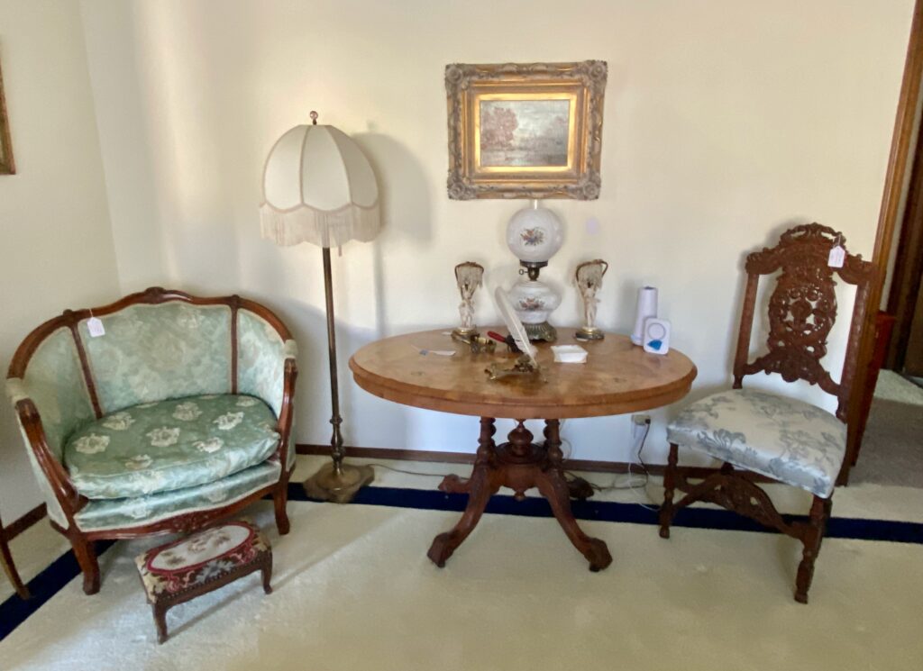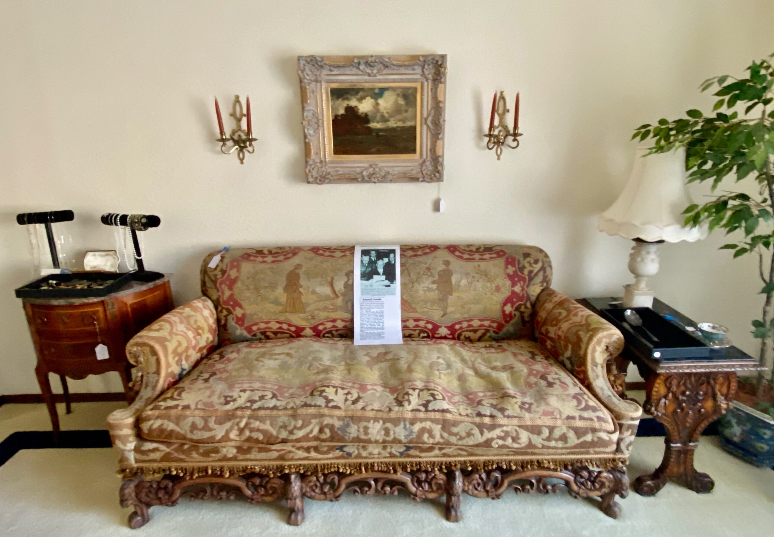 Louis XV Style Walnut Armchair, Needle Point Sofa, End Table